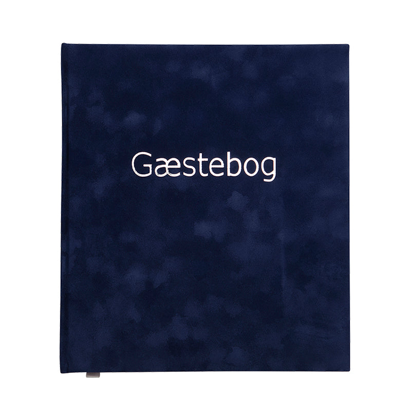 Smuk blå gæstebog med 84 blanke sider og sølvfarvet silkebånd i ryggen.
