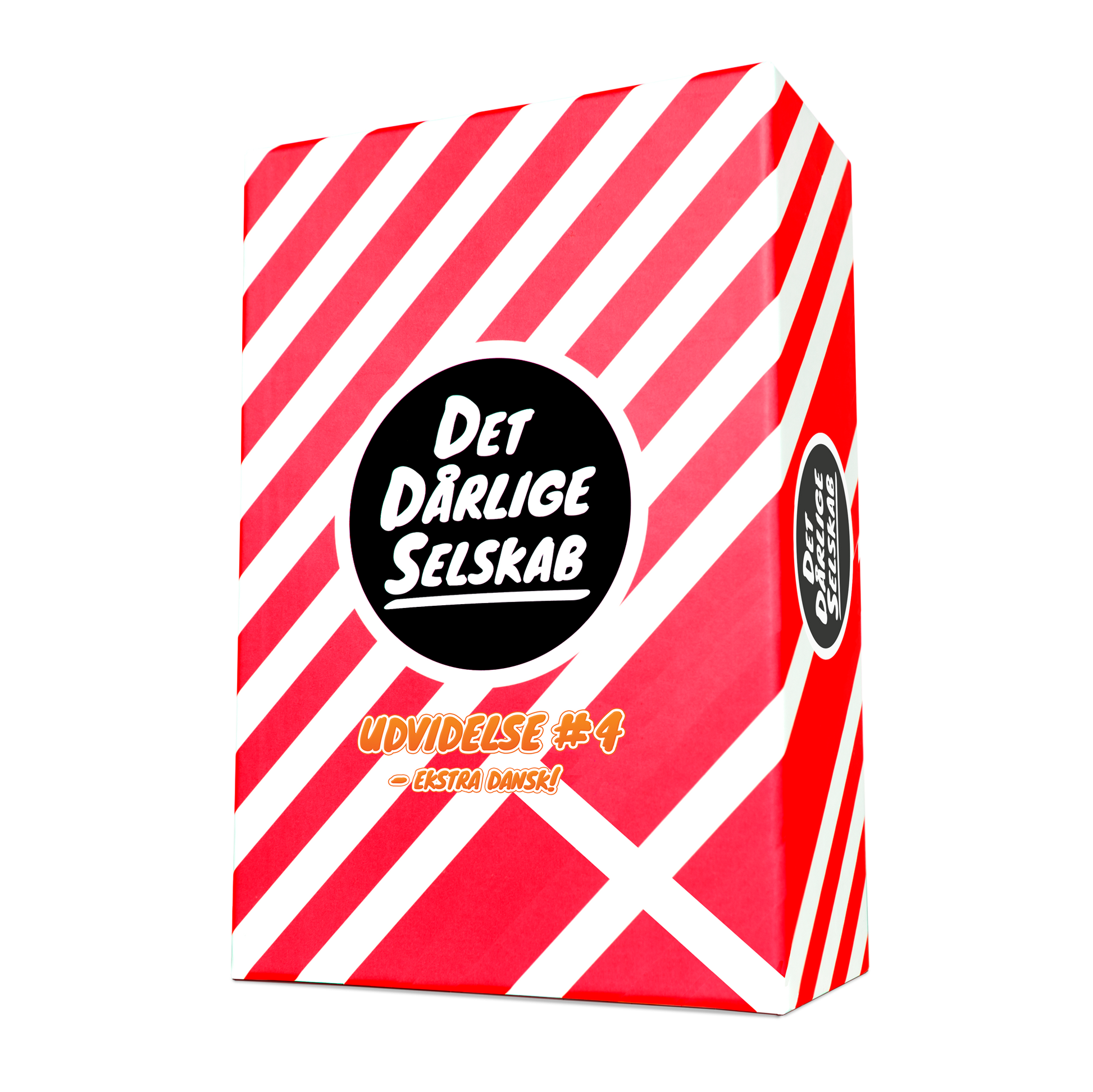 Udvidelse #4 - Ekstra Dansk! har samme format og indeholder samme antal kort som de øvrige 3 udvidelser. Æsken og kortene har røde striber og på æskens forside har vi indkorporeret Dannebrog, der matcher spillets tema.