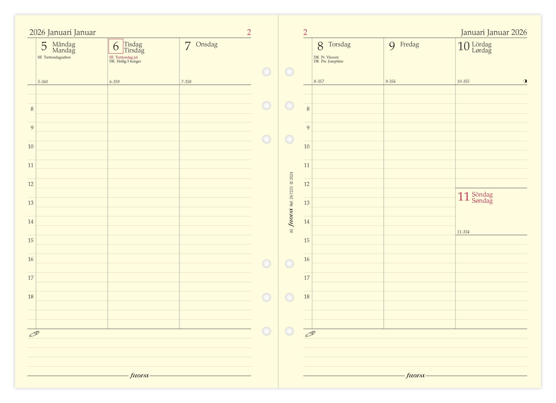 Filofax Diary A5 2026, lodret layout, uge pr. opslag. Sprog svensk/dansk/norsk. Cremefarvet papir.