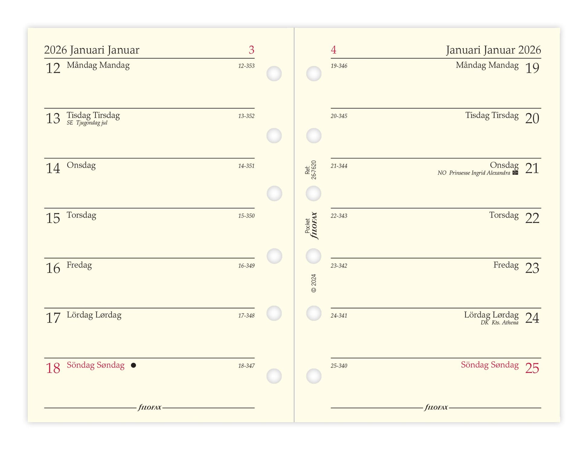 Filofax Dagbog 2026 tilbyder et layout med en uge pr. side i Pocket-størrelse. Den er tresproget (svensk, dansk og norsk).