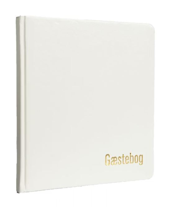 Hvid gæstebog i kunstlæder med 65 creme sider. På forsiden af bogen er der trykt GÆSTEBOG i guld i højre hjørne. I ryggen er der et flot cremefarvet silkebånd.
