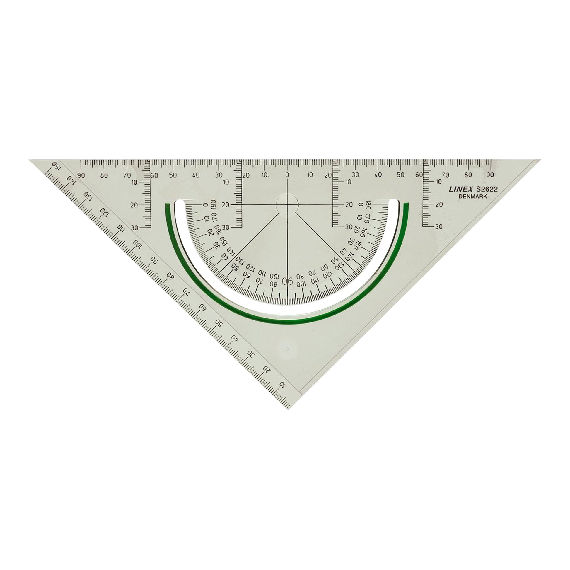 Linex-S2622 geometritrekant 22 cm i Linex Super Series med det unikke antislide princip. En gummiliste på bagsiden griber fat i den underliggende flade, og trekanten ligger fast. Kan anvendes som lineal, vinkelmåler og tegnetrekant. Med tuschkant, facet og lige kant samt vinkelmåler med lup over nulpunktet. Materiale: glasklar SAN.