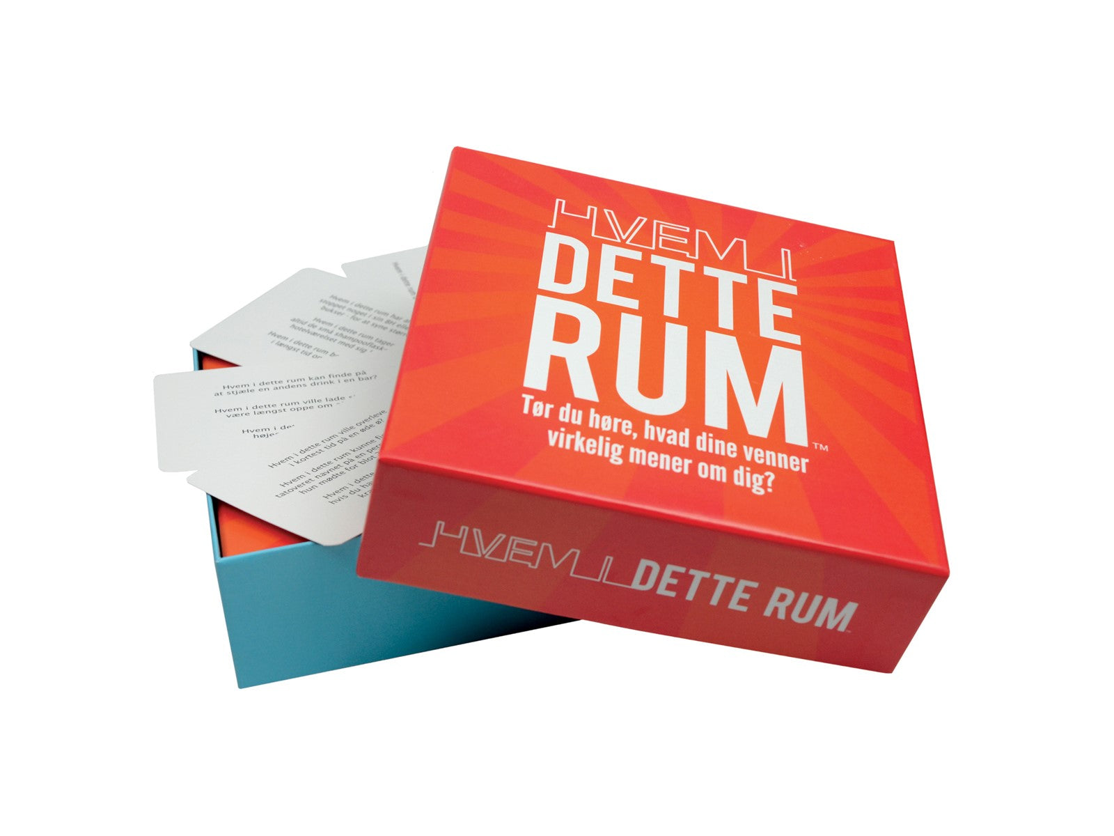Hvem har den bedste speaker-stemme, hvem smugkigger i andre menneskers toiletskab, og hvem bruger længst tid på at samle en reol fra IKEA? Hvem i dette rum tisser i brusebadet, og hvem i dette rumville overleve i kortest tid på en øde ø? Hvem i dette rum…? er navnet på et vanvittigt underholdende, udfordrende og medrivende selskabsspil, hvor det afsløres, hvilket billede vi har af hinanden, og hvad vi egentlig mener og tror om andre. Træk et kort, læs spørgsmålet højt for alle, lad alle tænke sig om et par sekunder, tæl til tre og lad så alle ved bordet pege på den person, de synes, passer bedst som svar på spørgsmålet