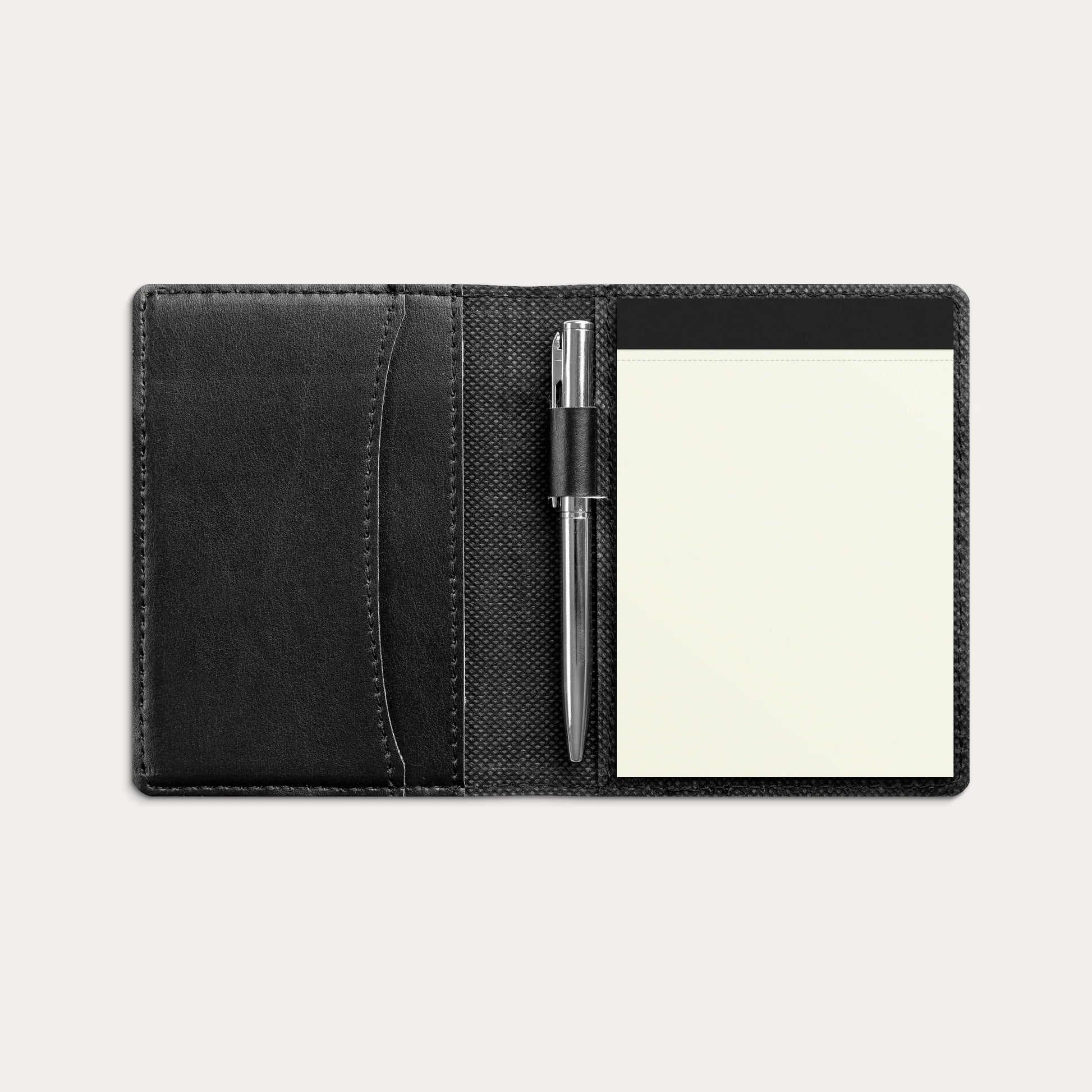Journalistblok A7 i cover med elastik og kuglepen.