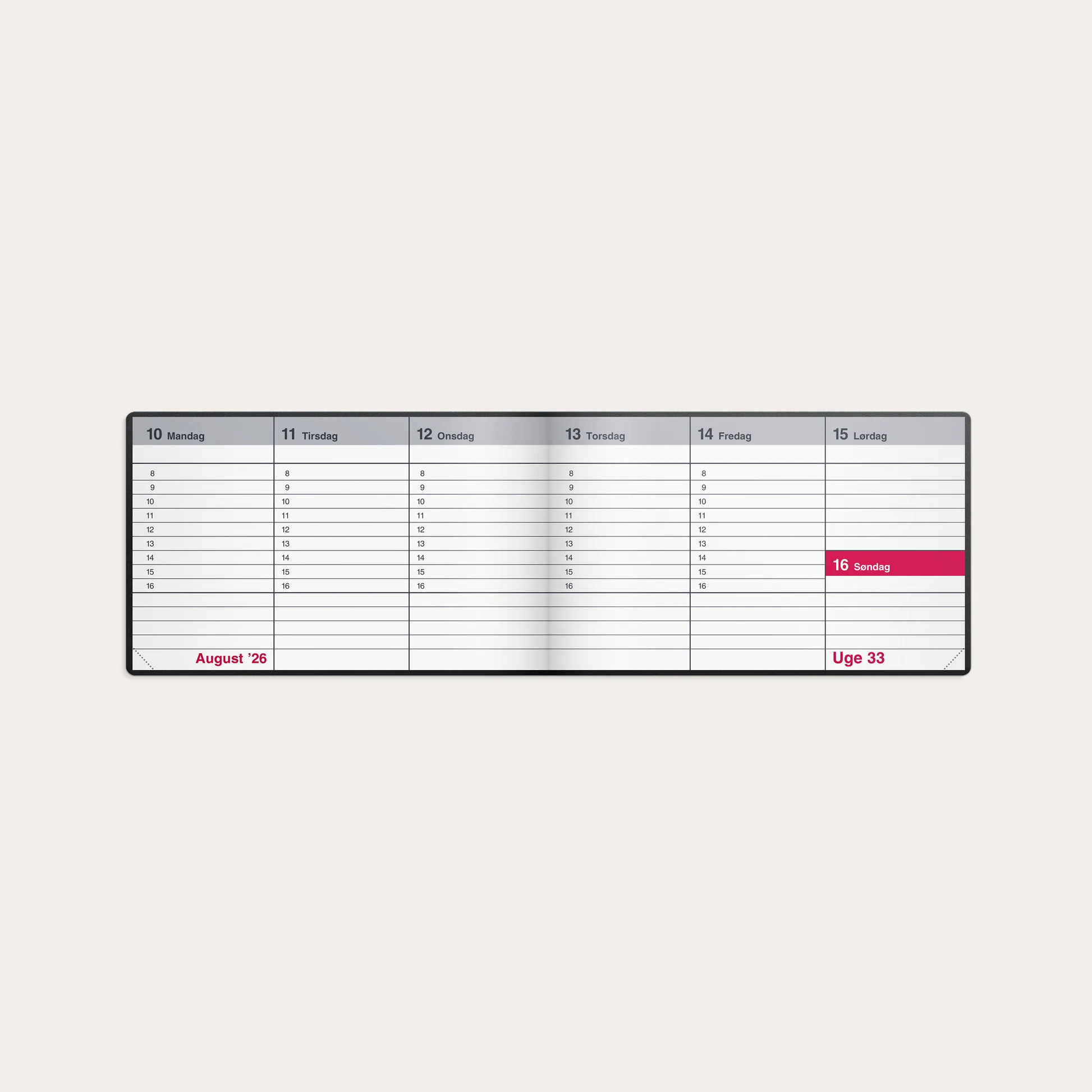 Mål: 94 x 154 x 9 mm. Layout: Uge/opslag. Højformat. Timeinddeling 8-16. Kalendarium: 2026-01-01 – 2026-12-31. Omslag: Plast. Indbundet. Indhold: Telefonregister. Sideantal: 134. Miljøoplysninger: FSC®. Varemærke: Mayland.