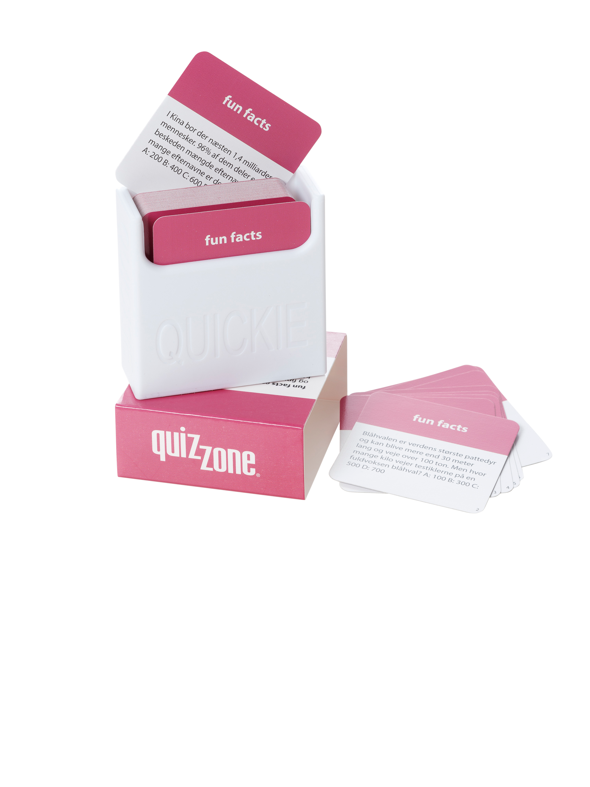 QUICKIE er en serie af 13 kompakte, hurtige quizspil fra quizzone. Det er små spil med stor underholdningsværdi, som kan tages med på farten eller bruges, når der skal spilles om, hvem der tager opvasken.
