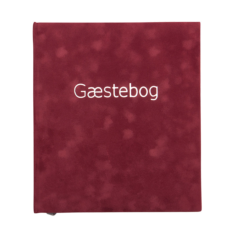 Smuk rød gæstebog med 84 blanke sider og sølvfarvet silkebånd i ryggen.