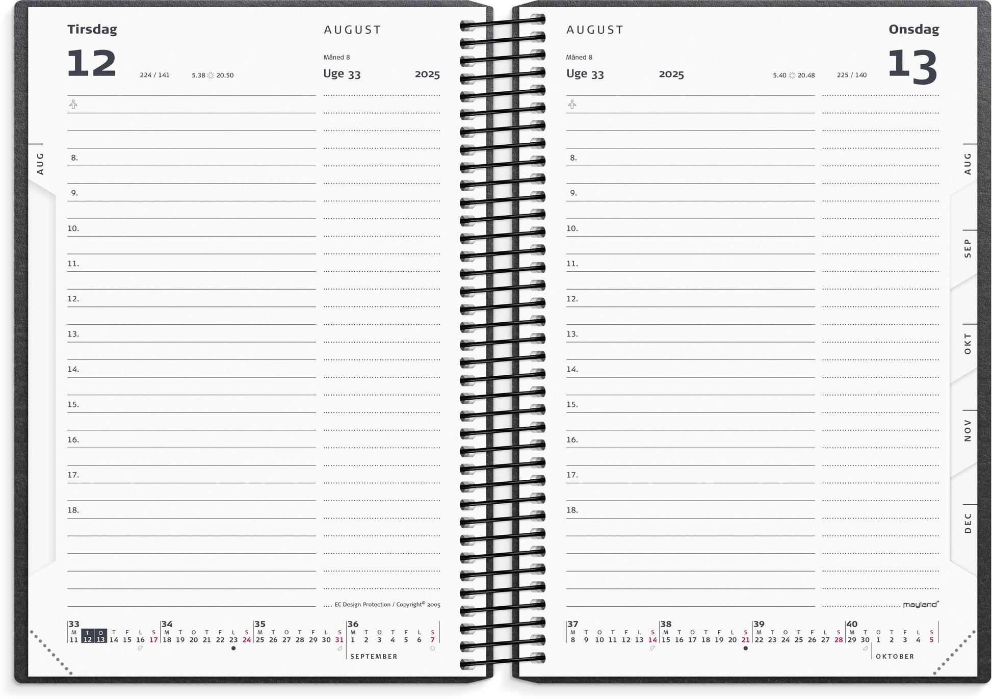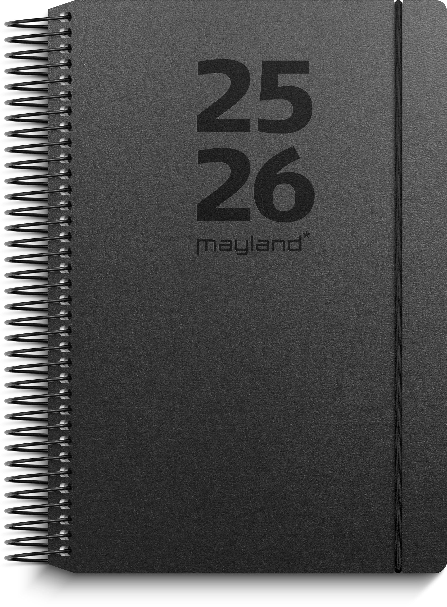 Format: 117×171 mm. Layout: Dag/side. Højformat. Timeinddeling 8-18. Kalendarium: 2025-07-01 – 2026-06-30. Omslag: Genbrugskarton. Spiralbundet. Detaljer: Elastik. Plastlomme. Indhold: Månedsoversigt, omregningstabel, udfoldelig årsplanner, formelsamling, lomme, stickersark, det periodiske system. Sideantal: 420. Miljøoplysninger: FSC®. Omslag i genbrugskarton. Varemærke: Mayland.