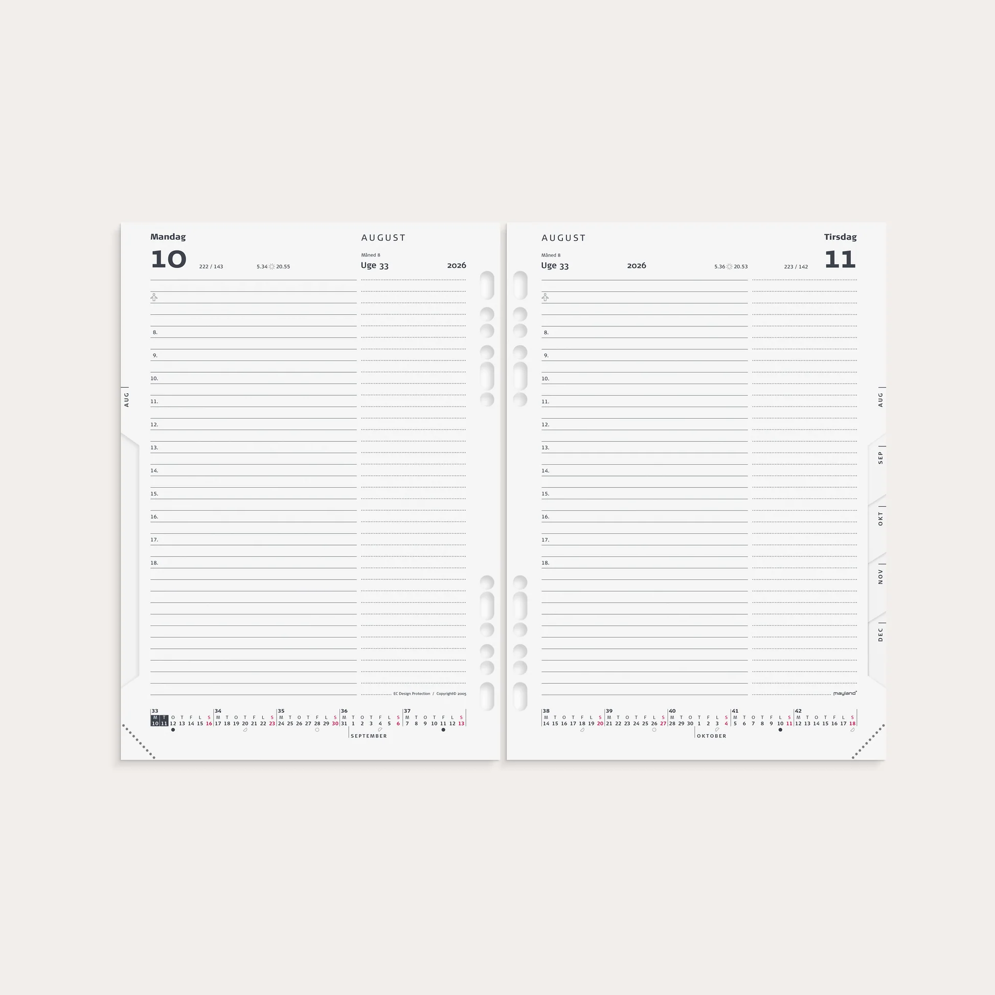 Format: A5. Mål: 215 x 151 x 26 mm. Layout: Dag/side. Højformat. Timeinddeling 8-18. Kalendarium: 2026-01-01 – 2026-12-31. Omslag: Karton. Indhold: Månedsoversigter. Sideantal: 400 + 10 pl. Miljøoplysninger: FSC®. Varemærke: Mayland.