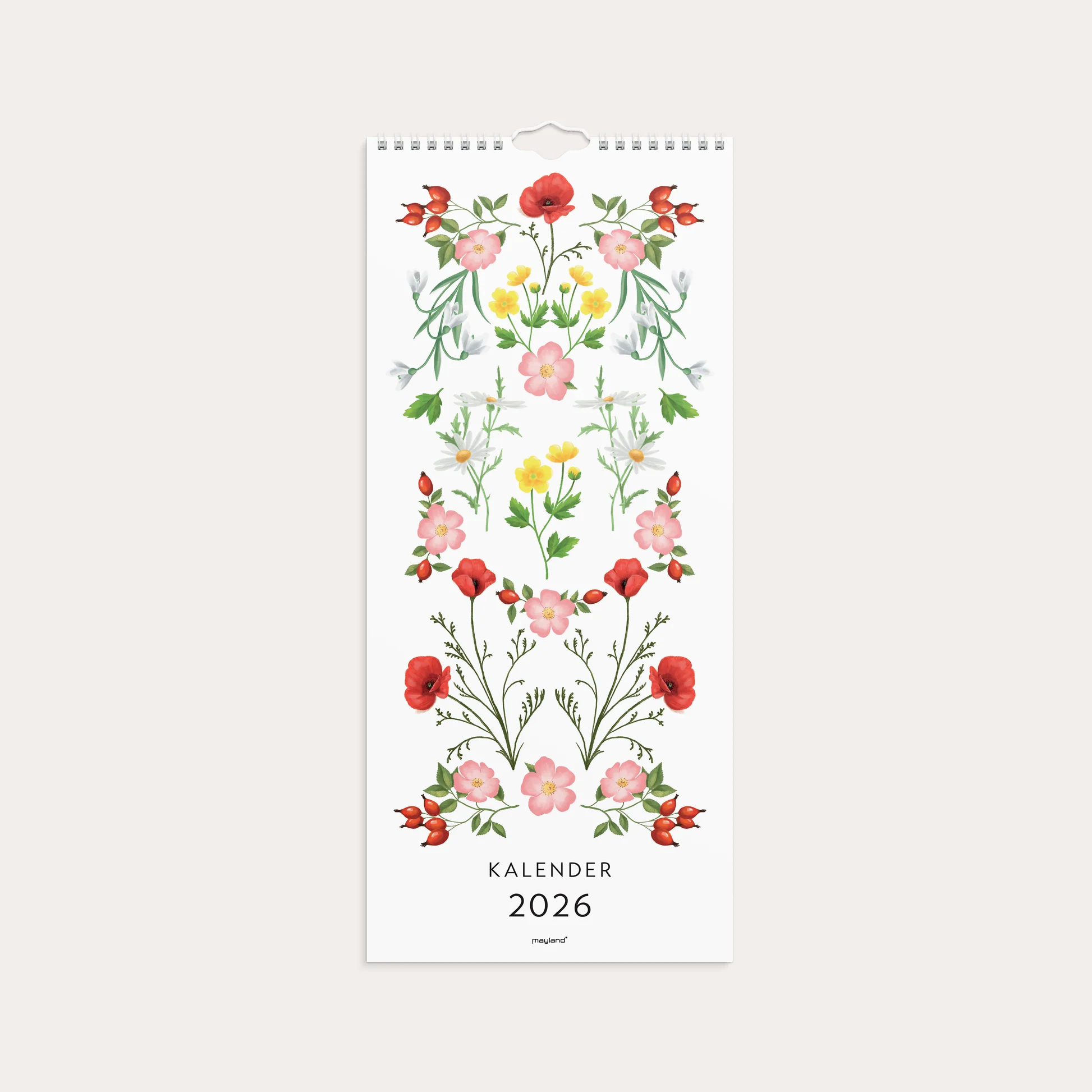 Mål: 434 x 190 x 10 mm. Layout: Måned/blad. Tværformat. Kalendarium: 2026-01-01 – 2026-12-31. Spiralbundet. Sideantal: 24. Miljøoplysninger: FSC®. Varemærke: Mayland.