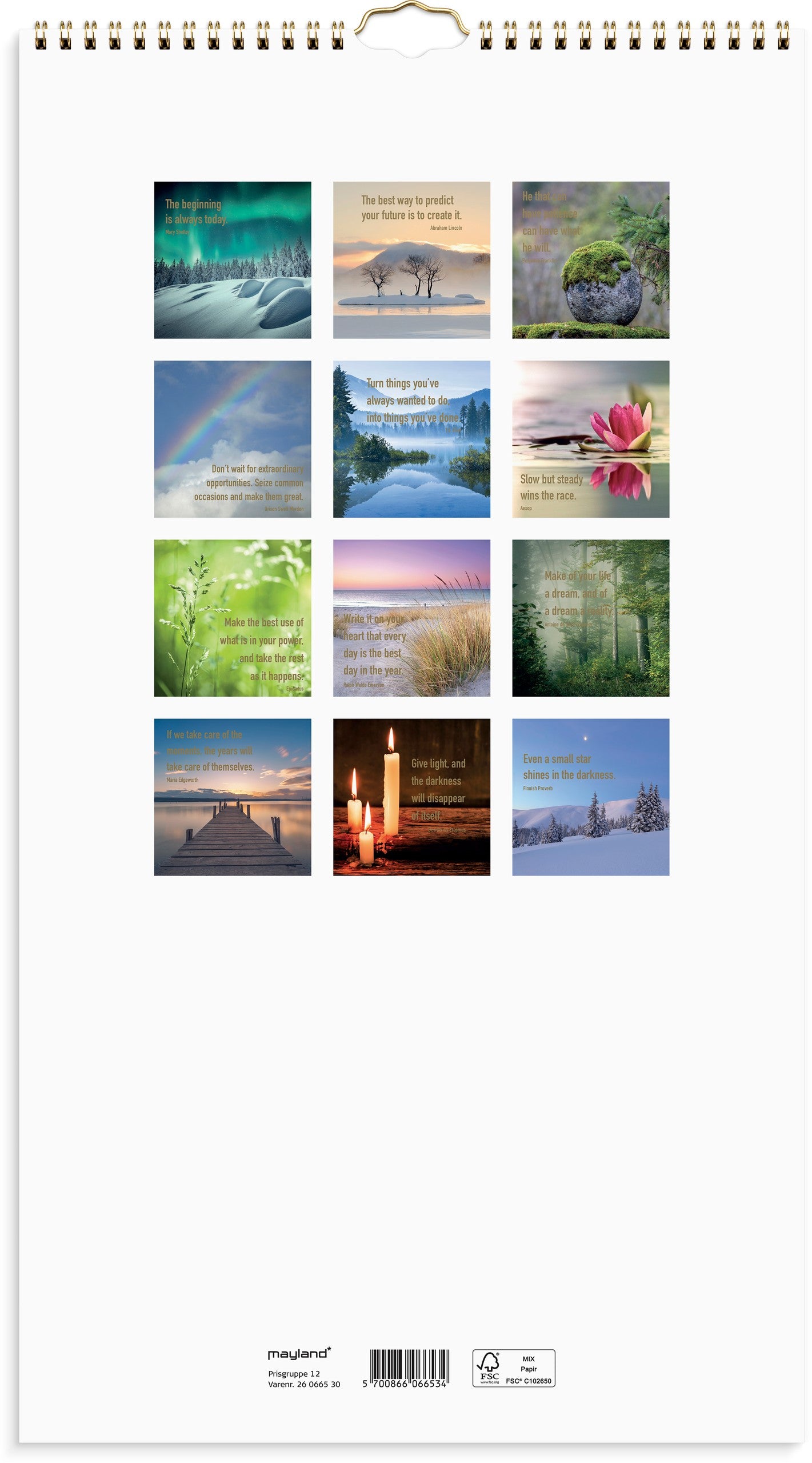 Billedkalender i karton til vægophæng. Kalenderen er spiralindbundet og er illustreret med 12 flotte billeder samt positive citater i guldfoliepræg. Vægkalenderen giver dig en oversigt over 1 måned ad gangen, så du hurtigt og nemt kan skabe et godt og overskueligt overblik over den enkelte måned.