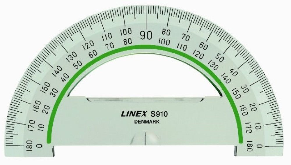 Linex-S910 halvcirkulær vinkelmåler 10 cm i Linex Super Series med det unikke antislide princip. En gummiliste på bagsiden griber fat i den underliggende flade, og vinkelmåleren ligger fast. Inddelt i 180 grader med modgående skala. Materiale: glasklar SAN.