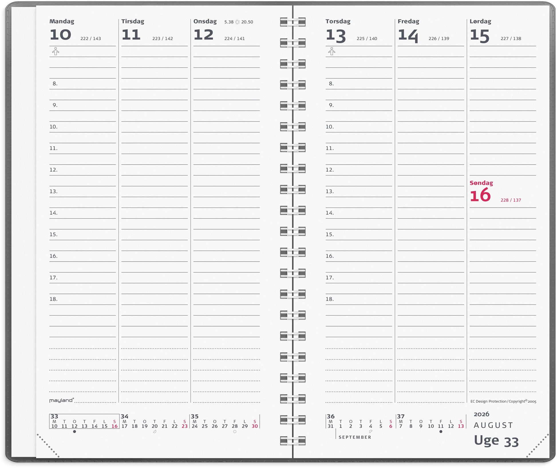 Mål: 175 x 100 x 13 mm. Layout: Uge/opslag. Højformat. Timeinddeling 8-18. Kalendarium: 2026-01-01 – 2026-12-31. Omslag: Karton. Spiralbundet. Indhold: Månedsoversigter. Sideantal: 128 + 14-pl. Miljøoplysninger: FSC®. Varemærke: Mayland.